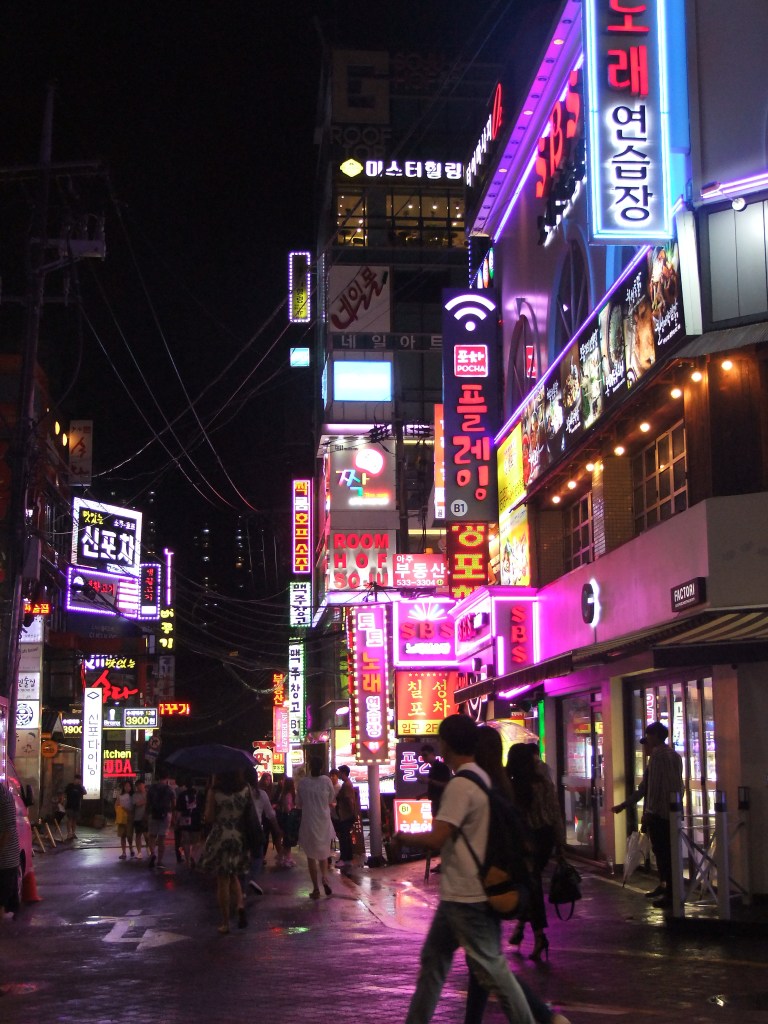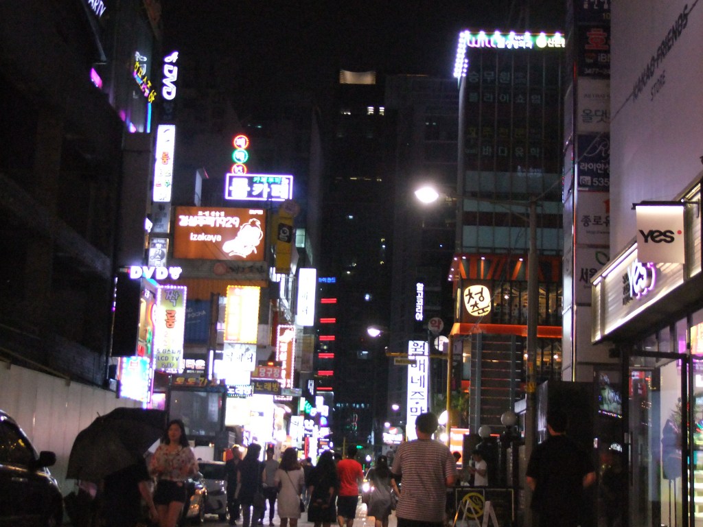 Hmmm gece hayatı dediğimizde sanırım akla ilk gelen yer hepimiz aynıdır….Hadi aynı anda tahmin edelim 3…2…1… Oppan Gagnam style. Evet maalesef bunu yapmalıydık çünkü mekan ve semt üzerine şarkı yapıldı ise ne kadar tuhaf bir yer olduğunu tahmin edebilirsiniz. Gagnam oldukça hareketli bir bölge aslında. Gündüzleri iş merkezleri olması sebebi ile her yerde lüks restaurantlar ,kafeler ve takım elbiseli korelileri görürken geceleri resmen bir değişim yaşayarak her yer gece klübü, bar, pub ve sokak eğlencesine dönüşüyor. Seoul’ün geri kalan bölgelerine göre daha pahalı olması sebebi ile bir nevi bizim buraların Etileri ne bilelim biz Nişantaşısı ama daha uç bir duruş sergiliyor. Mekanlar oldukça kaliteli ve fiyat performans oranları iyi diyebiliriz. Her eğlence anlayışına uygun mekan bulmak mümkün. Ama bizim en çok merak ettiğimiz şey kore dizilerinde gördüğümüz brandalı seyyar soju restaurantlarında ramyeon ve kimchi yemek olduğu için tercihimizi buradan yana yaptık. Ama neon tabelalar güzel yemekler yiyebileceğiniz restaurantlar ve alabildiğine oyun salonları burayı sarmış durumda bizim tavsiyemiz en azından 1 akşamınızı burada geçirmeniz yönünde.( Gangnam İstasyonu – 2 no’lu metro hattı , 10. Yada 11.’I çıkış)